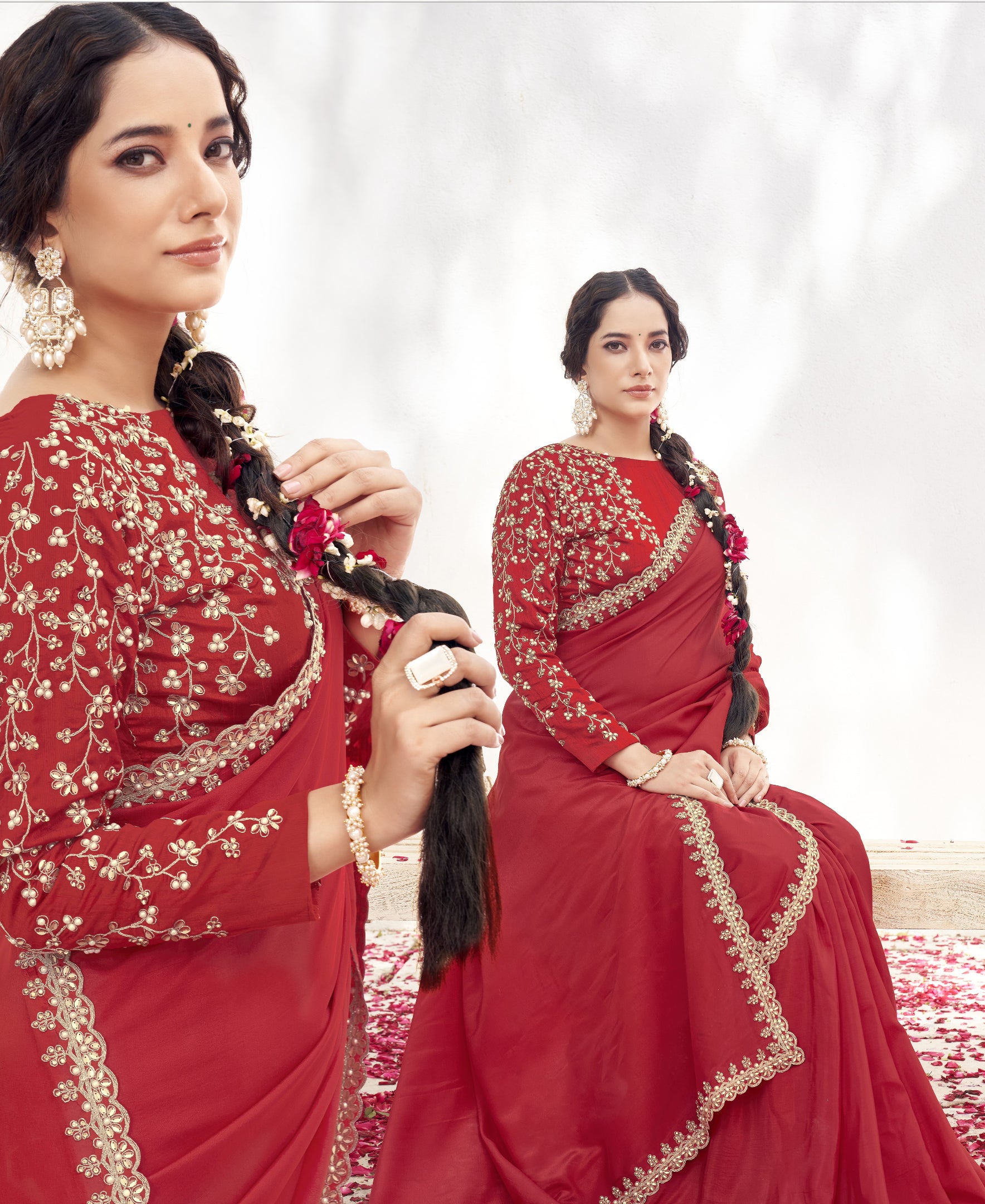 Discover The CollectionElevate your elegance with ARYA, a stunning Red Crepe Satin Silk Saree. Exquisite handwork, luxurious drape for unforgettable moments.
