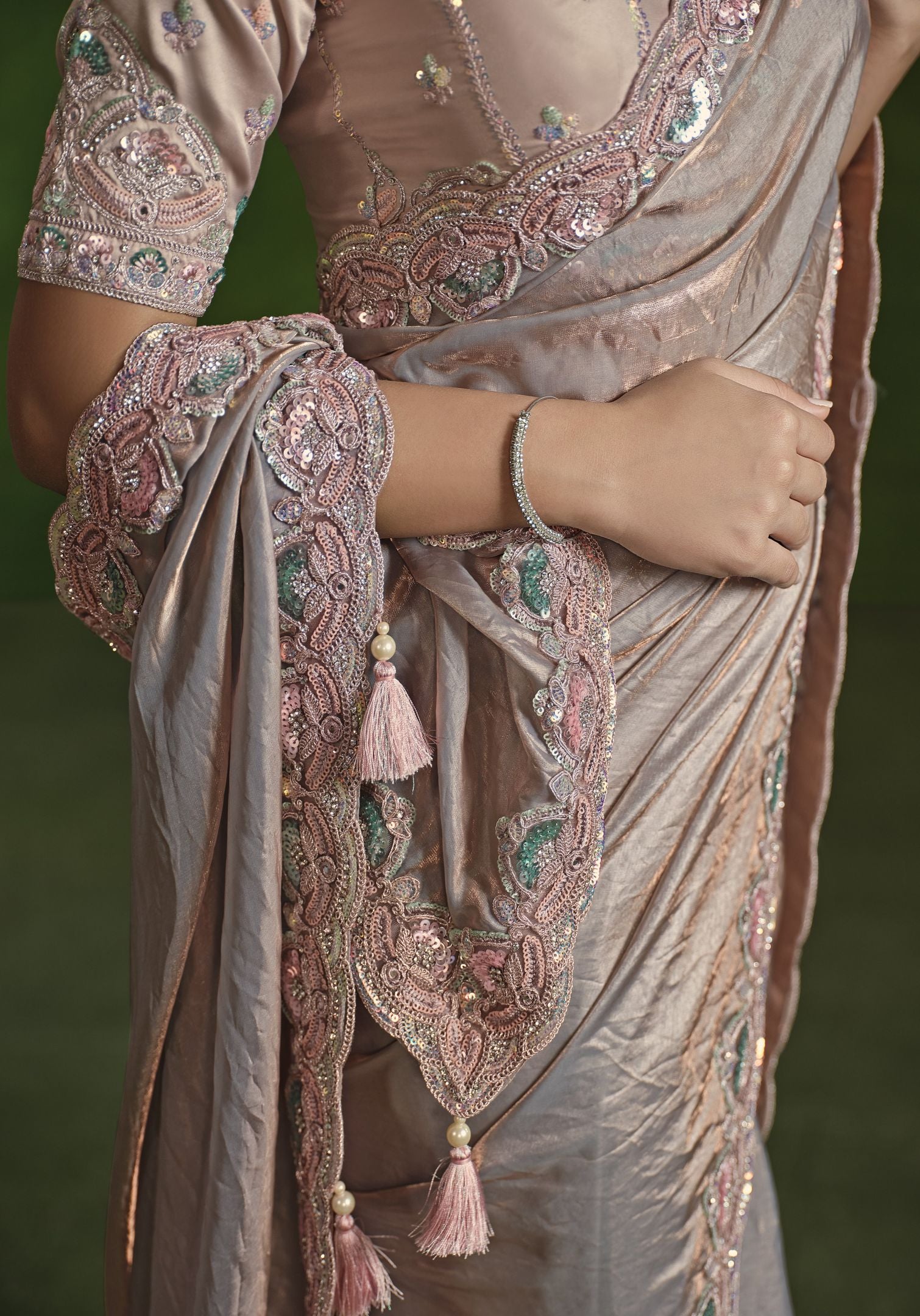 Peach 2-Tone Satin Silk Saree: Dual Sequence, Diamond Work, Stitched Blouse from Ranjhana Collection