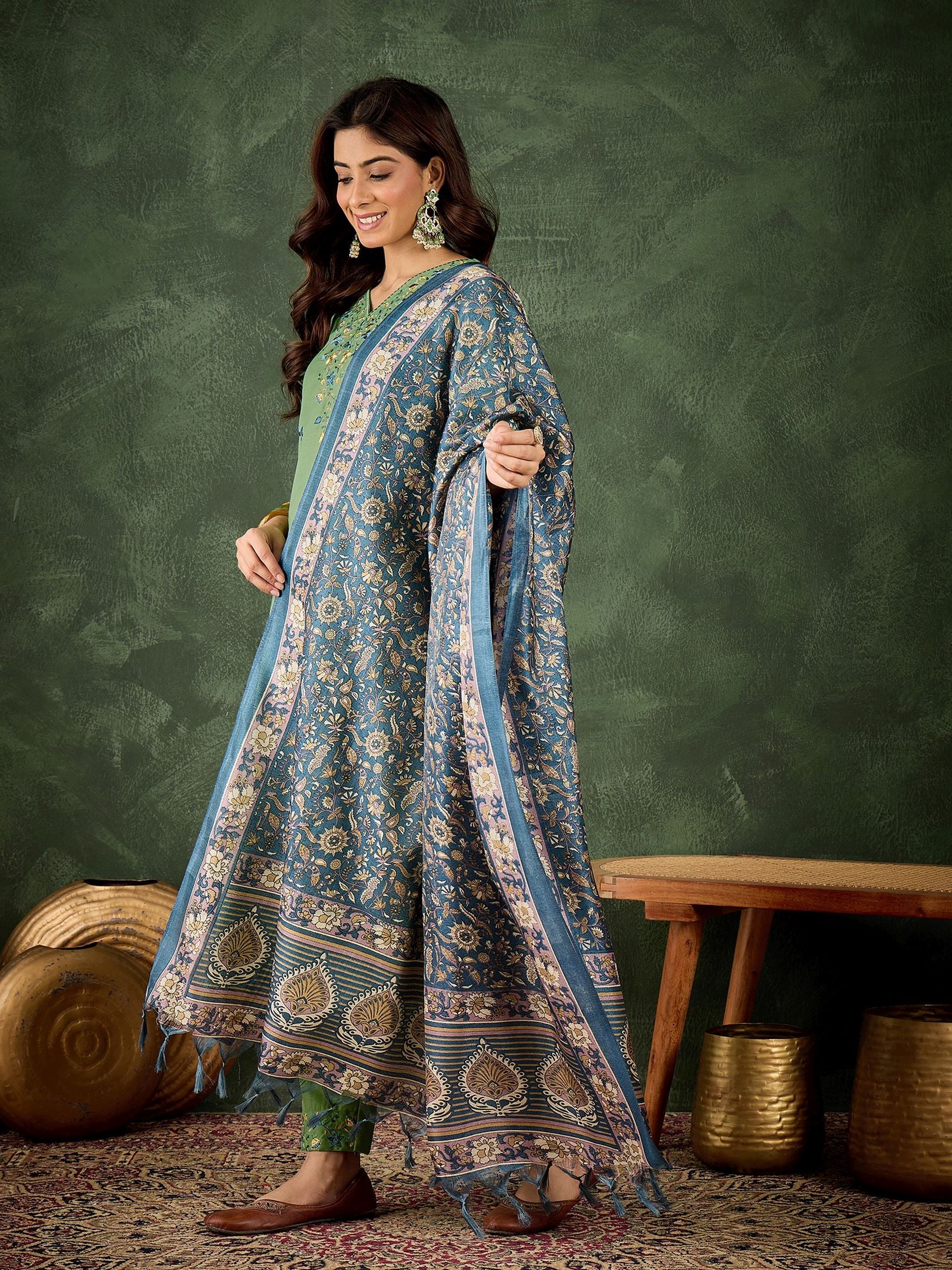 Pista Cotton Blend Readymade Suit: Green Printed Art Silk Dupatta
